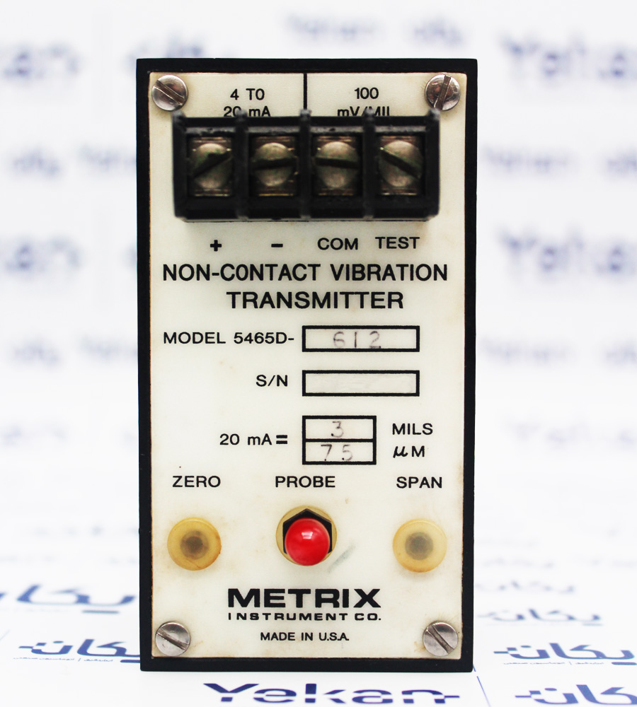 ترنسمیتر 5465D در دسته سنسورهای غیرتماسی قرار دارد و متعلق به شرکت Metrix آمریکا میباشد. درایور (ترانسمیتر)، کابل واسط ( Extension Cable) و پراب (Probe)، LOOP سیستم پراکسیمیتی ( Proximity System) را جهت اندازهگیری جابهجایی (Displacement) ارتعاش (Vibration) تشکیل میدهند. اندازهگیری وایبریشن میتواند در دو حالت Static (موقعیت) و Dynamic (لرزش) انجام بگیرد. ترنسمیتر 5465D جهت اندازهگیری مقدار وایبریشن displacement مورد استفاده قرار میگیرد. نمایی از ترنسمیتر 5465D در شکل پایین نمایش داده شده است.